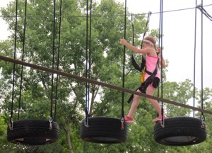 She stepped forward tenuously, then with a little less hesitation, then even more confidence. She moved slowly but crossed planks and tires and more steps, holding onto the wires and harnessed in safely. Brian was right behind her all the way, with her, encouraging her.