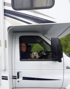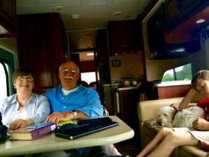 We arrived at Camping World, got the part set-up, the Pilot towed and all climbed in the RV for the remainder of the drive. It was fun to watch Mom and Daddy snuggle up next to each other at the table, tossing popcorn to Coop, who snuggled on the couch with Bear. Ash curled with his pile of books in the back and Bella chattered away next to her brother. We were all together and it was so right, so good.